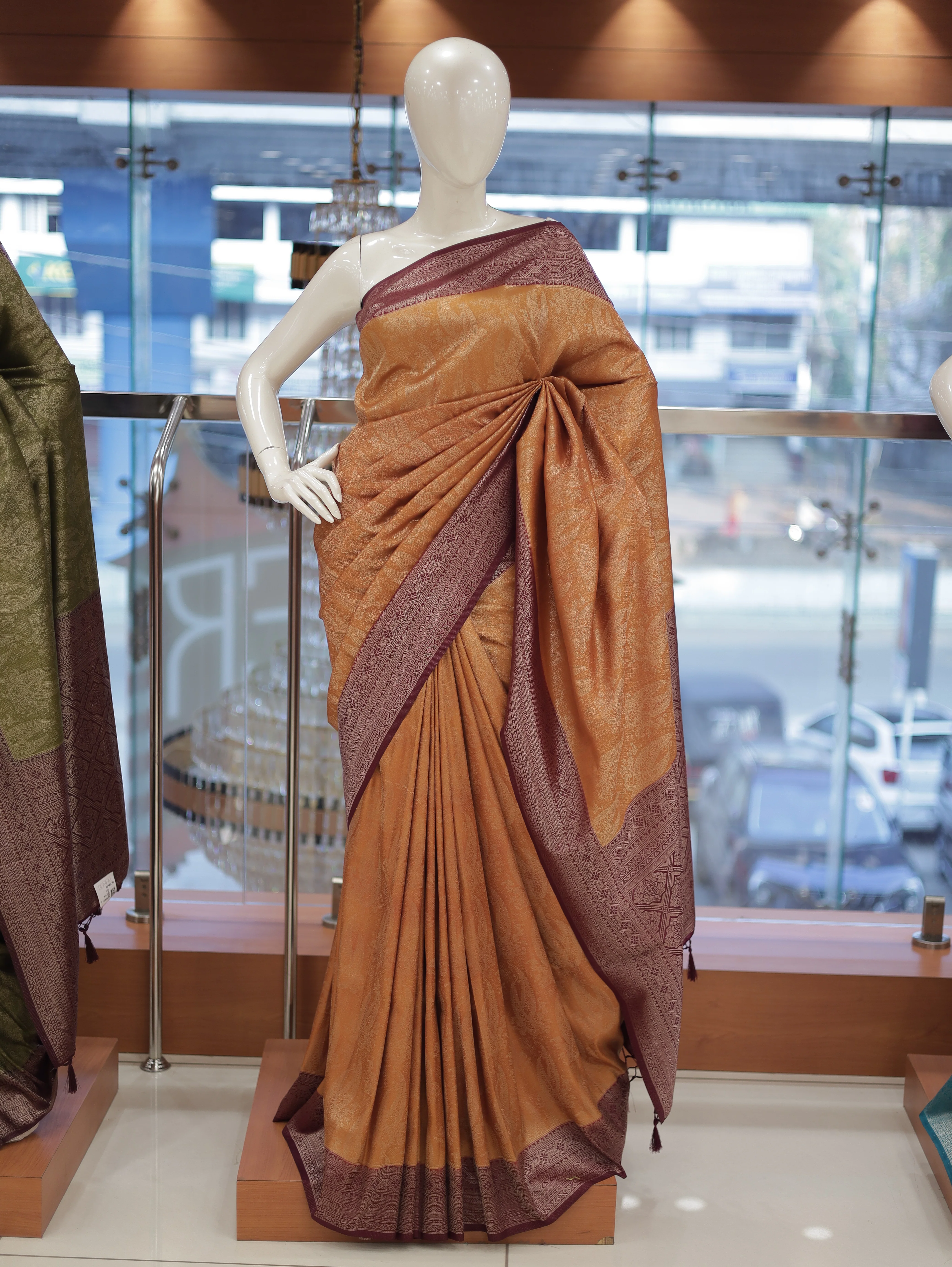 Elevate your ethnic elegance with this timeless Semi Banarasi Saree, crafted to showcase rich traditional charm with a graceful modern touch. Designed with classic Kalka motif patterns, this saree features beautiful contrast colour combinations that enhance its regal appeal.